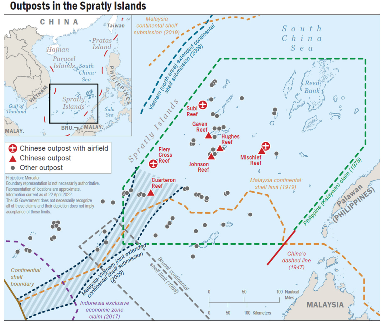 The PRC has added more than 3,200 acres of land to the seven features it occupies in the Spratlys. [The] outposts provide airfields, berthing areas, and resupply facilities that allow the PRC to maintain a more flexible and persistent military and paramilitary presence in the area. This improves the PRC’s ability to detect and challenge activities by rival claimants or third parties and widens the range of response options available to Beijing.
