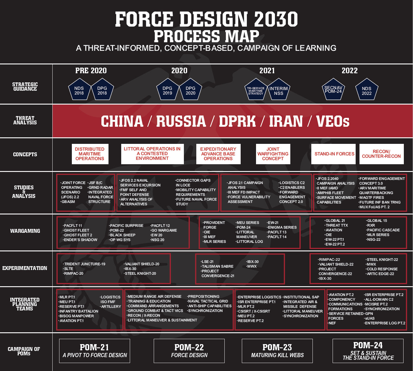 The third criticism is that Force Design 2030 and the MLR concept have not gone through the rigorous combat development (joint capabilities integration development system [JCIDS]) process. While this allegation is difficult to ascertain, it certainly seems that the Force Design 2030 process has gone through the typical large number of institutional checks (as can be seen in the graph below). Additionally, Commandant Berger, before assuming the responsibilities of the office of the Commandant, served as not only the Commanding General of Marine Corps Combat Development Command, but also the Deputy Commandant for Combat Development and Integration. Both of these positions are directly responsible for the combat development process and respond directly to the Commandant.