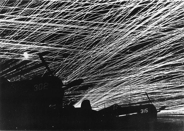 5th Anti-Aircraft Artillery Battalion (Formerly 5th Defense Battalion) throws a wall of tracers and steel upwards to intercept a Japanese Air Raid over Okinawa. Marine Corsairs are parked in the foreground. Department of Defense photo (USMC) 08087 by TSgt C.V. Corkran