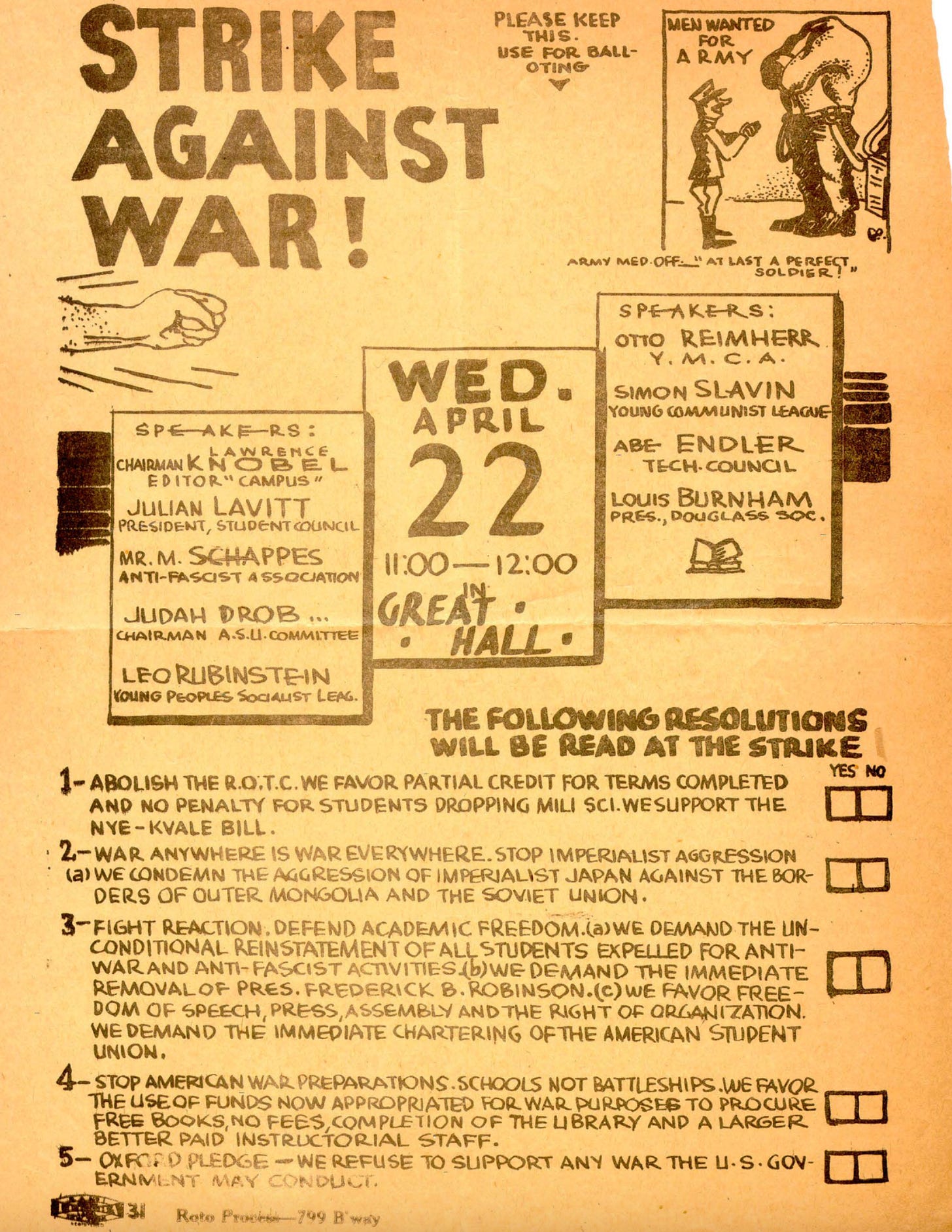 This flier advertises an April 22, 1936 anti-war demonstration in the Great Hall at the City College of New York (CCNY). The event, attended by 3,500 students, featured addresses from student and faculty leaders as well as a vote that reaffirmed the students’ fight against both the ROTC on campus and CCNY President Frederick Robinson.
